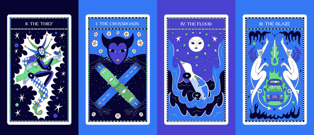 Ana was commissioned by ALA to create tarot cards showing unfortunate incidents that lead to writing off your car; a fire, a flood, a car accident and a theft. Leaning into the fortune teller world, these incidents come to life in The Blaze, The Flood, The Crossroads and The Thief.